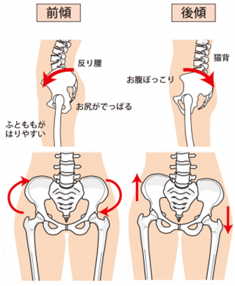 一般的に「骨盤の歪み」と呼ばれるのは、骨盤が前に傾きすぎている・後ろに傾きすぎている・左右の高さが違う・ねじれている、といった状態です。そしてこれらは、骨盤を支える体幹全体の機能が低下することで起きやすくなります。