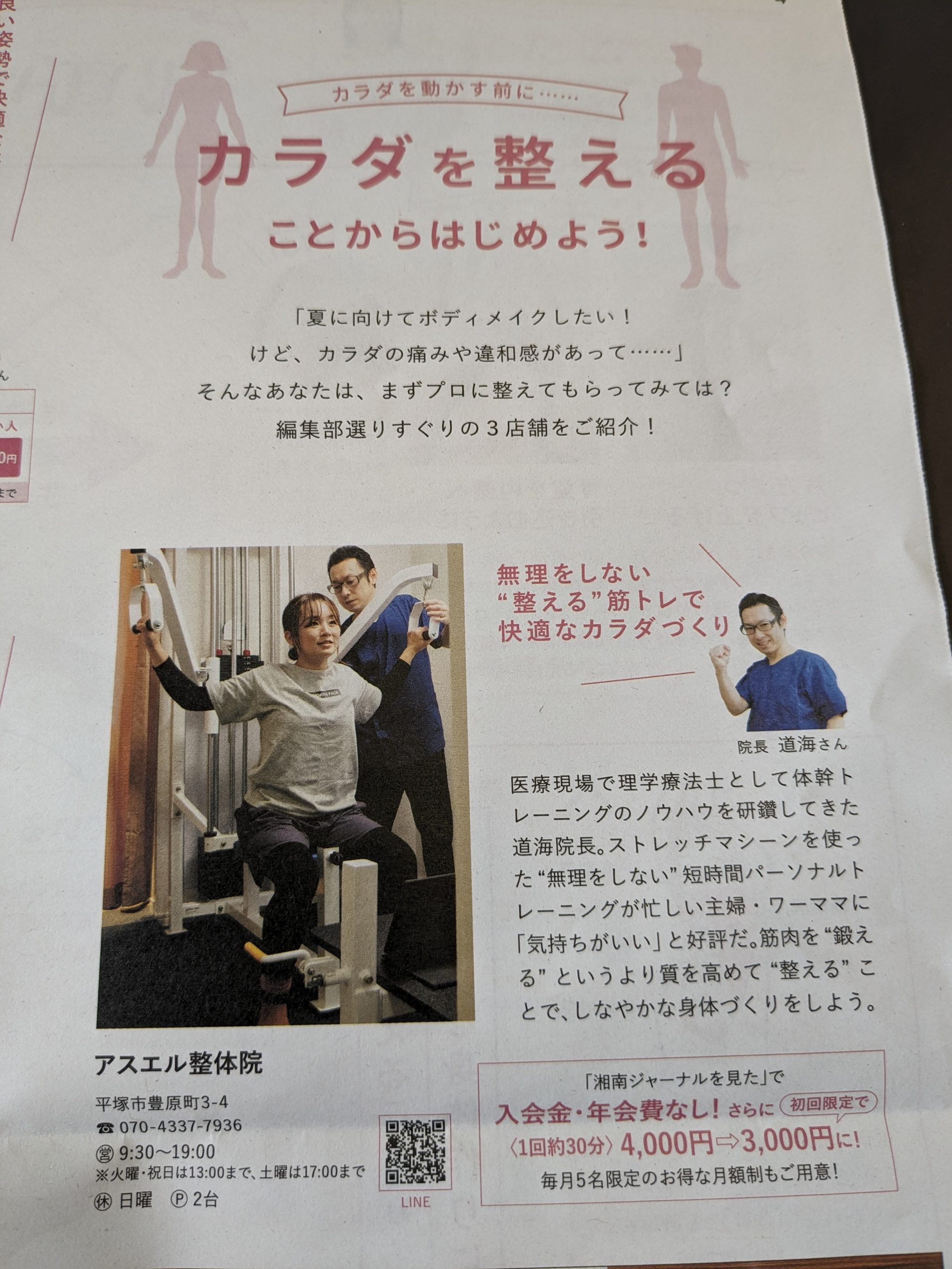 #湘南ジャーナル#平塚#大磯#二宮#伊勢原#茅ヶ崎#テレワーク#整体#平塚整体#骨盤矯正#美容整体#姿勢矯正#猫背#小顔#肩こり#腰痛#O脚#頭痛#産後#肩甲骨#パーソナルトレーニング#側弯症
