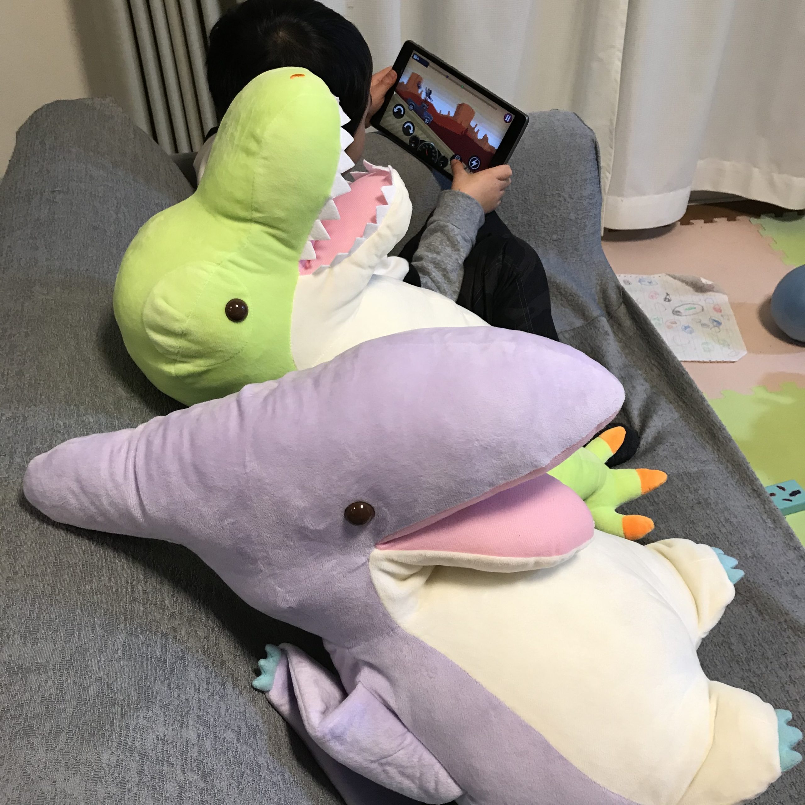 子供二人が恐竜が好きなもので、大きい恐竜のぬいぐるみを見つけたら最後。難しくても取らないわけにはいかなくなりますね!